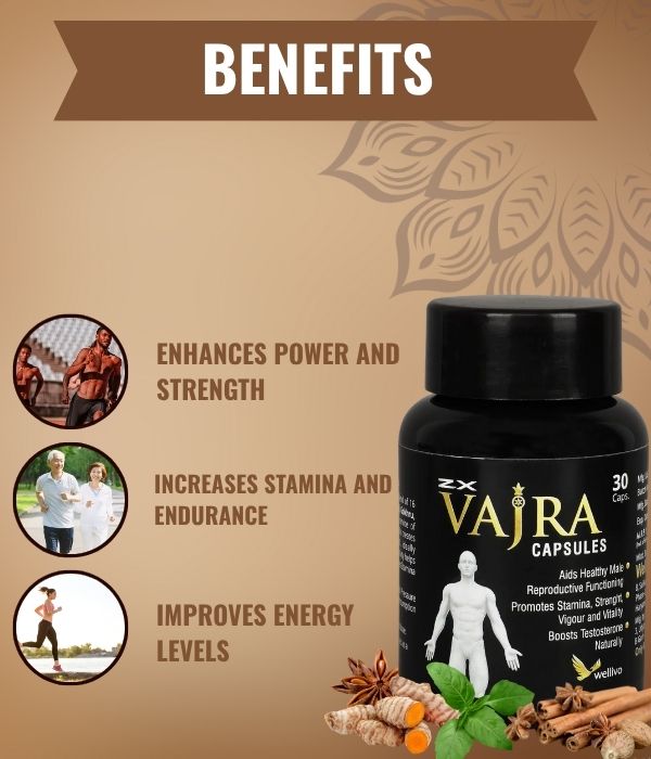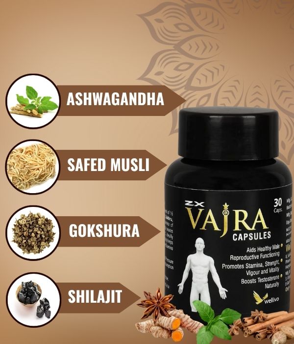ZX Vajra Capsules are herbal testosterone booster tablets made up of ingredients such as Ashwagandha, Shilajeet, Shatavari, and Safed Musli, which give a natural boost to testosterone levels, enhancing energy levels and muscular strength, blessing you with better fitness.